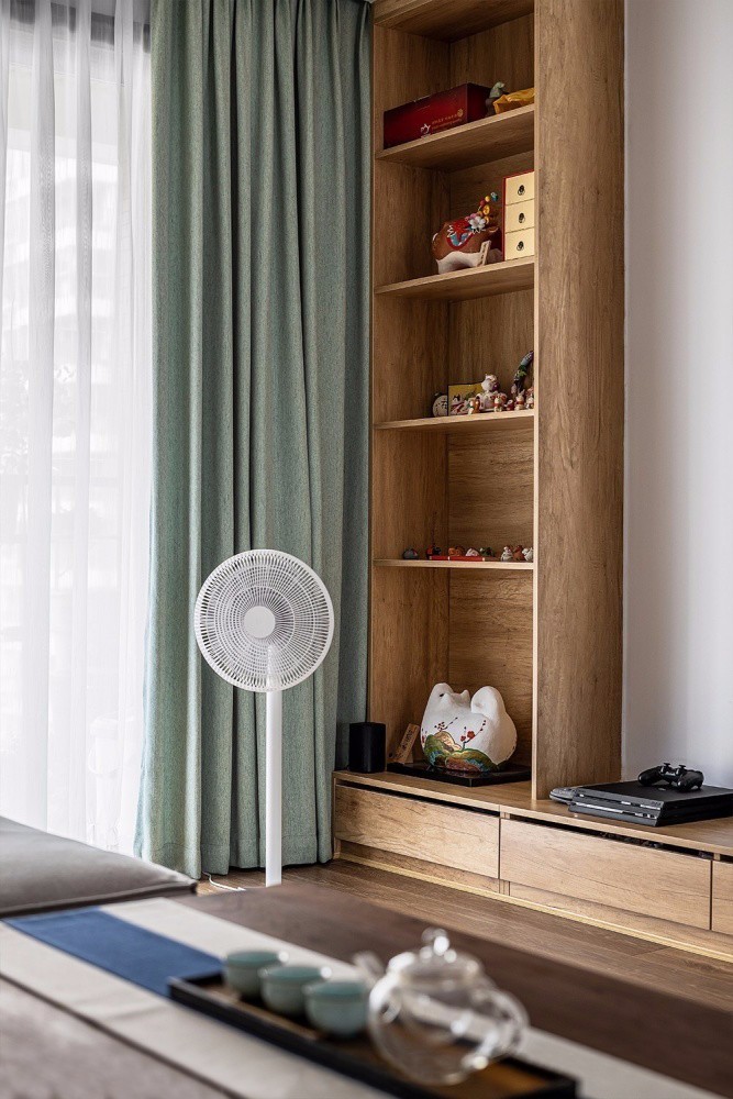 客廳利用半墻加窗戶的形式與書房連接,并在沙發(fā)背景墻左側(cè)利用書房空間做成了儲物柜,將行李箱安置地妥妥的,中部留空的設(shè)計便于小物件的取放。