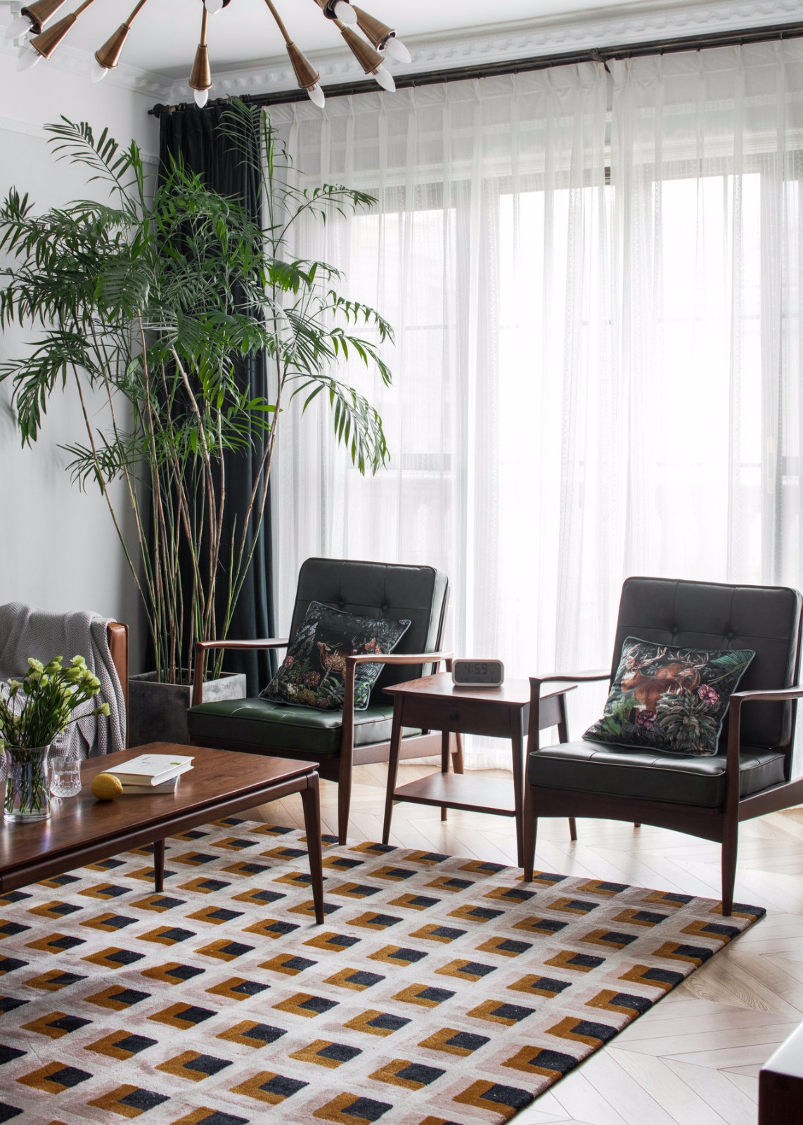 客廳大體是一家三口最長活動(dòng)場所,這個(gè)區(qū)域我總體采用的功能性和美觀性結(jié)合的方式。 整體色調(diào)的統(tǒng)一:整體以胡桃實(shí)木的顏色做總色調(diào),從胡桃實(shí)木的茶幾到胡桃木的電視柜,再到棕色調(diào)的真皮沙發(fā),最后再是一塊長方形的大地毯,做幾個(gè)顏色(淺白+棕色+黑色)的重疊,與整個(gè)空間所有顏色進(jìn)行呼應(yīng)。房主很喜歡夏威椰,因?yàn)橛兄竦臍赓|(zhì),因此它別名也叫夏威夷竹子。濃綠的色彩,茂密的枝條,富有光澤的綠葉傳遞給人一種欣欣向榮的精神氣。它能通過呼吸微調(diào)節(jié)空氣環(huán)境,吸收房中甲醛等揮發(fā)性物質(zhì)。從風(fēng)水上來講,它放在柱子下面有去煞氣之說。