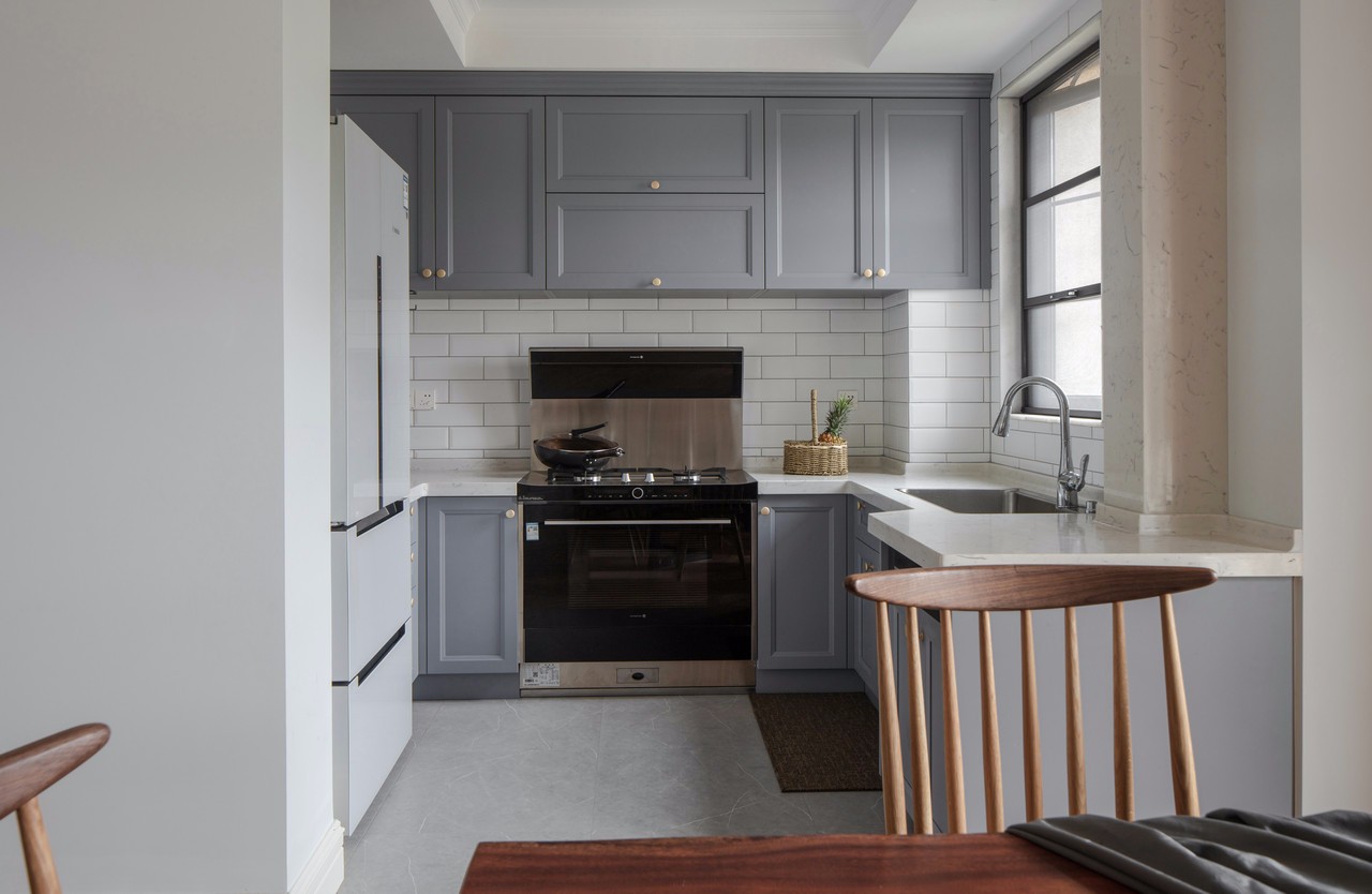 因廚房原來的面積本來就較小,為了改善這個(gè)問題,我們還是采用了開放式廚房。整個(gè)區(qū)域與餐廳區(qū)域結(jié)合,這里不做區(qū)隔,方便媽媽做菜的時(shí)候,可以和餐廳的人進(jìn)行互動(dòng)。 當(dāng)然,開放式廚房,有一個(gè)小建議,因?yàn)槌床擞蜔煹膯栴},建議購買大功率吸油煙機(jī)。房東買的集成灶,既節(jié)省空間,也方便使用。因?yàn)槭占{空間足夠,所以平常不使用的時(shí)候,臺面也可以保持整潔如新。
