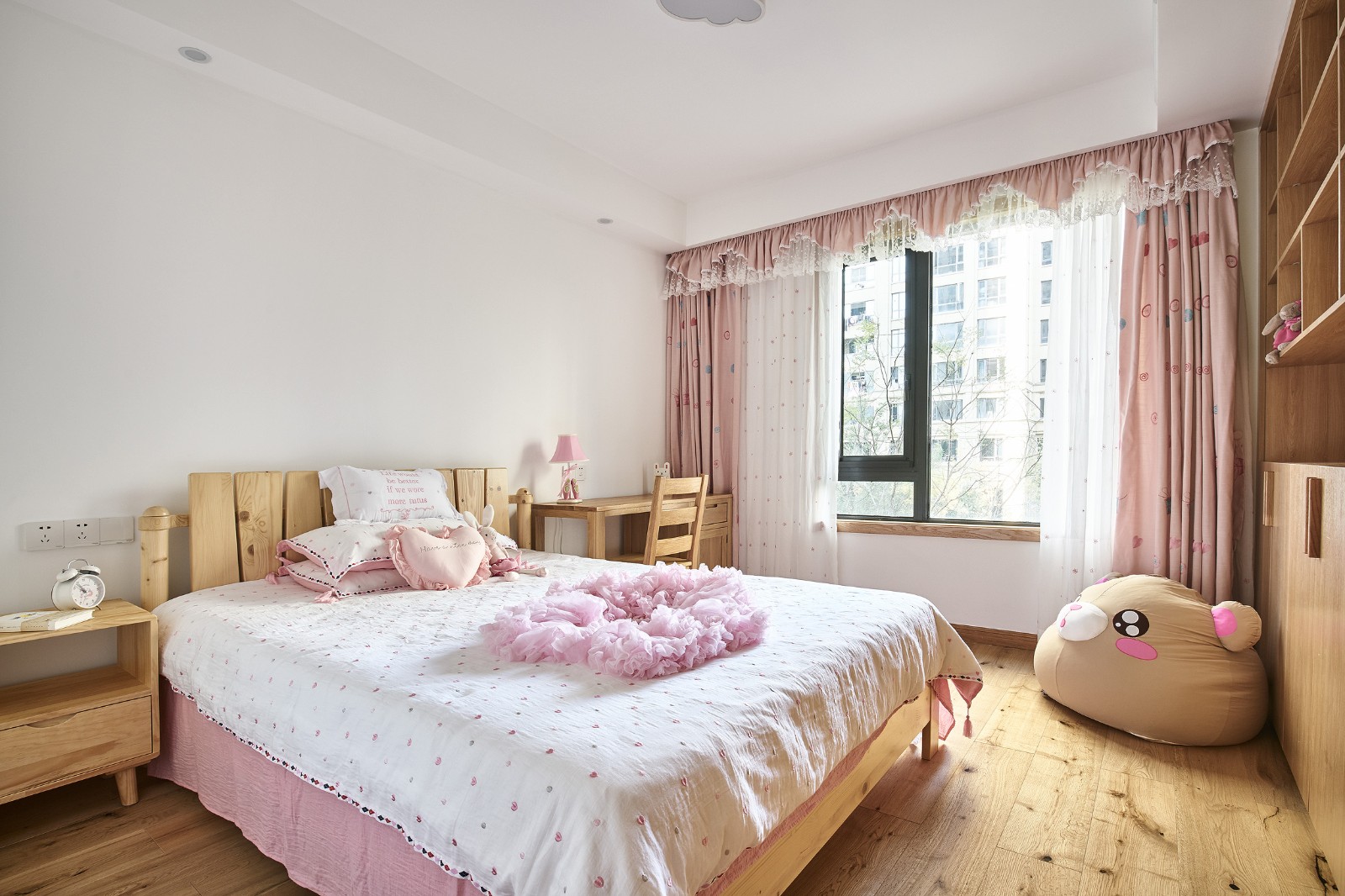 粉色的公主城堡,房間主體部分仍是原木色,易變更部分如床品窗簾,可以根據(jù)小朋友的喜好更換。