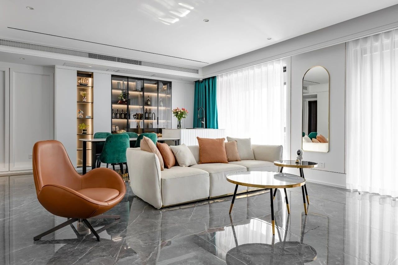 整體以灰白為主,用墨綠、橙色、金屬元素作為點(diǎn)綴,勾勒出空間層次的線條感,營造一種活潑輕松的氛圍