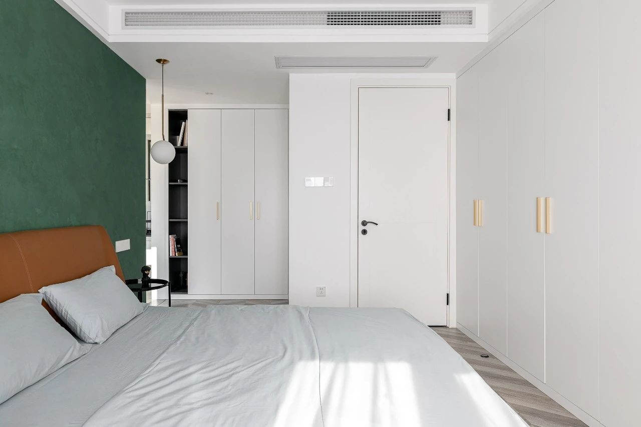 主臥的設(shè)計(jì)也延用了公共空間的配色,墨綠色作為床頭背景色,搭配黃色的皮革床,營造出低調(diào)高雅的氣質(zhì)。