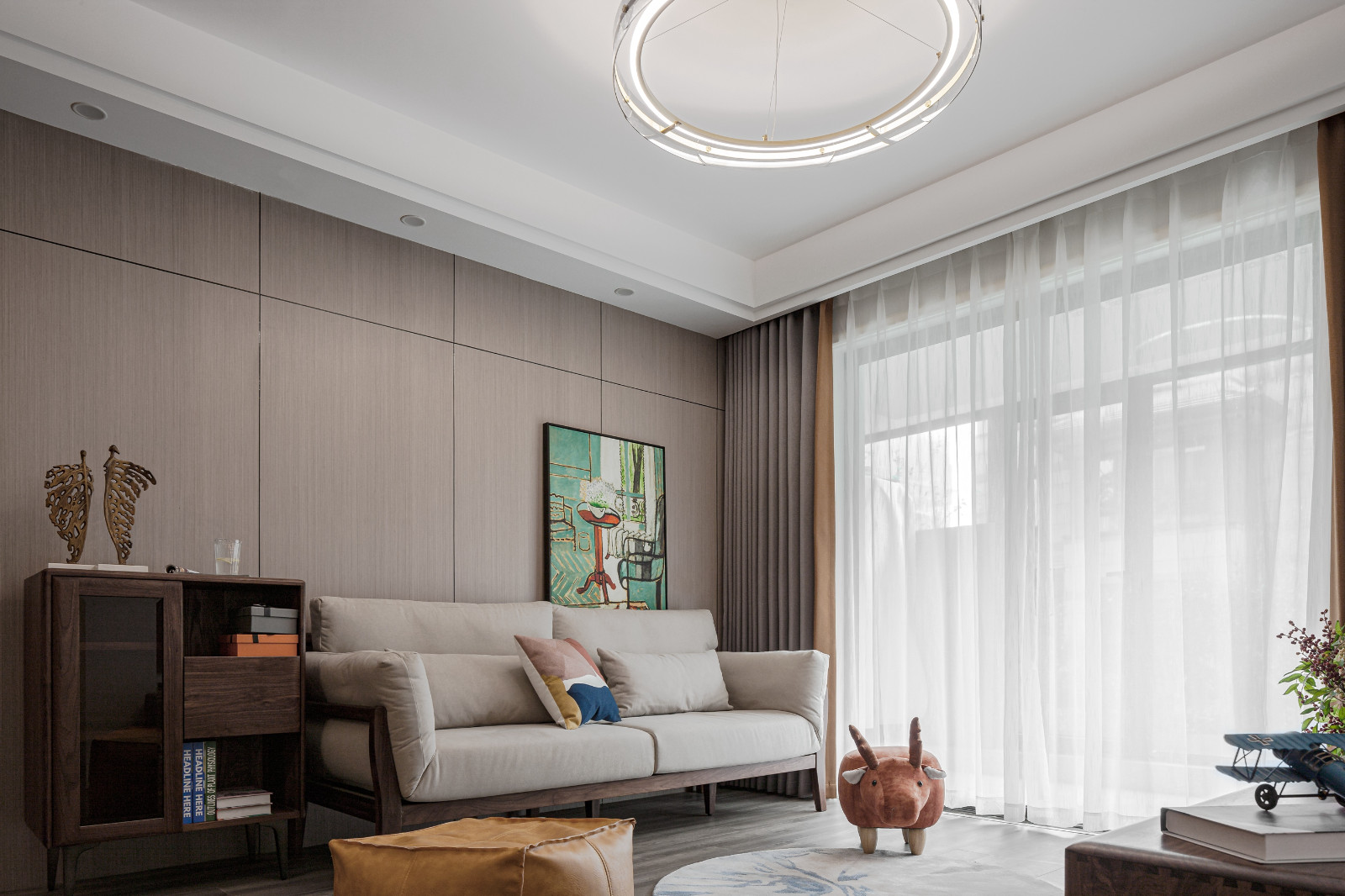 客廳戶型方正,整面木飾面板裝飾沙發(fā)背景墻,原木家具搭配米色布藝沙發(fā),文藝淡雅。