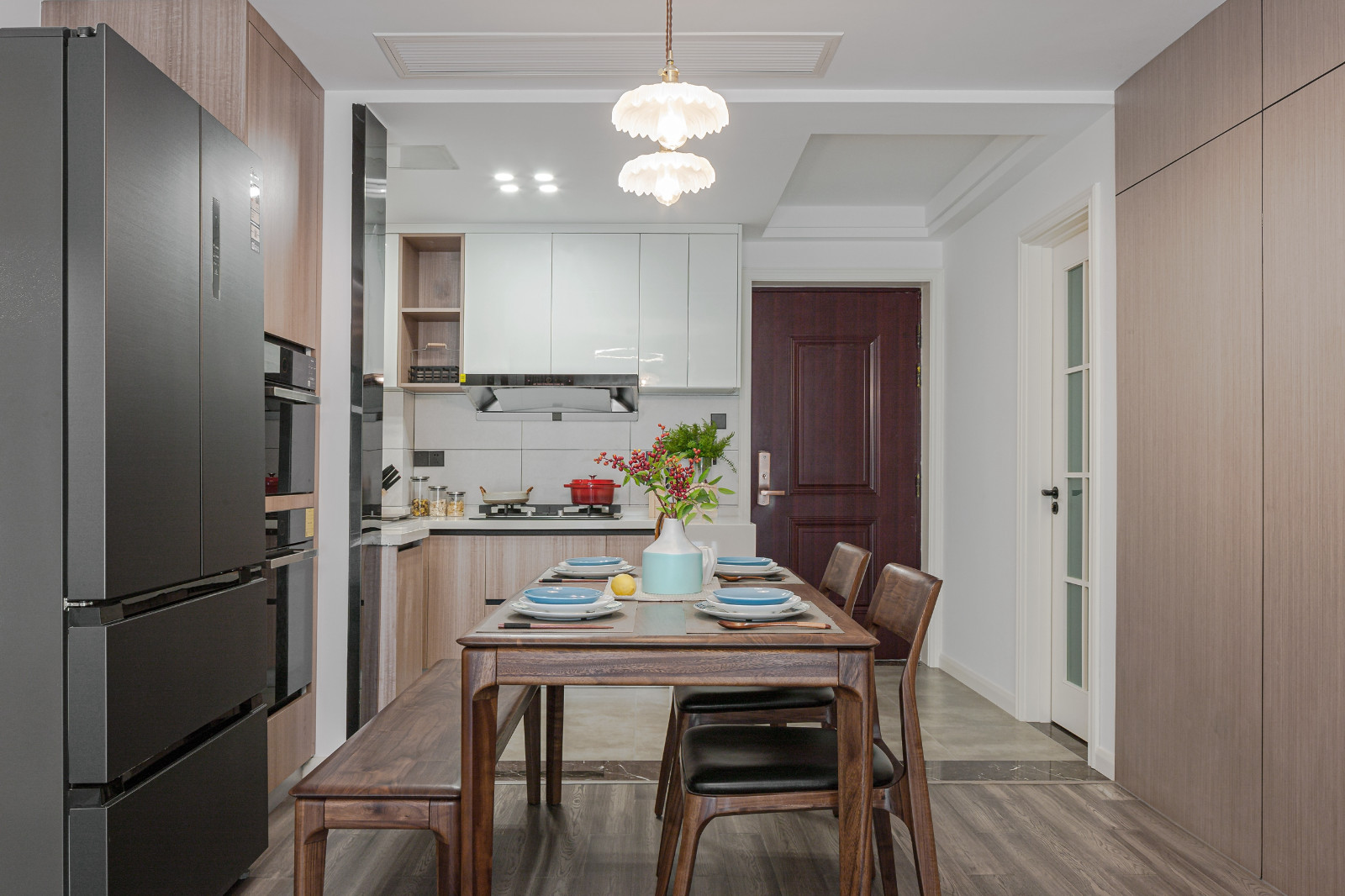 餐邊靠墻延伸廚房承重墻的厚度,做櫥柜高柜以及嵌入式冰箱,合理規(guī)劃空間,美觀實(shí)用。