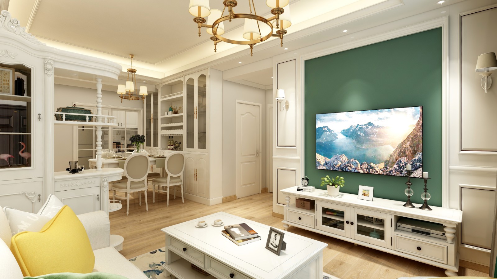 電視背景墻以簡潔干練的石膏線打造,讓空間層次更加豐滿,輔以兩盞時(shí)尚壁燈,營造精致優(yōu)雅的氛圍。